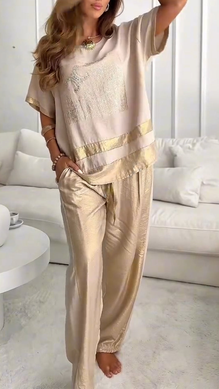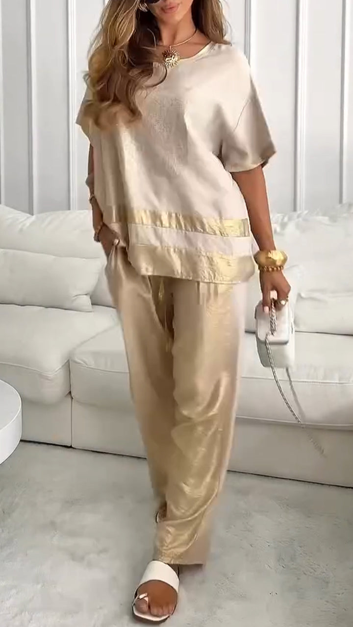 Women's Round Neck Stitching Gold-stamping Casual Suit